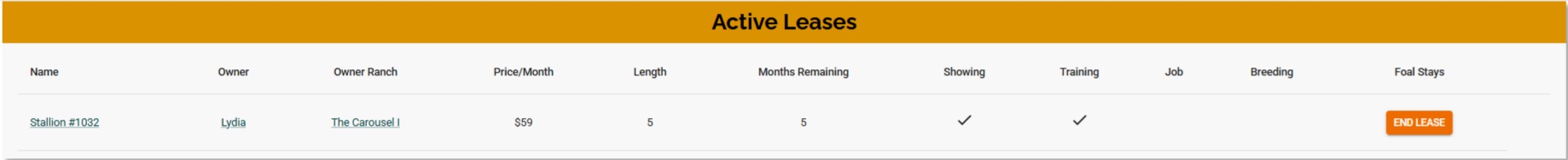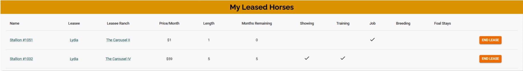 Leases will end automatically at the end of the agreed lease period, but either party can also choose to end the lease early by going to their Ranch page, and the Sales & Leases tab. For the lessee, the horse will be listed under ‘Active Leases’. For the lessor, the horse will be under ‘My Leased Horses’.