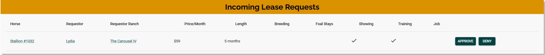 Once the player clicks confirm, the lease request will be sent to the lessor to approve or deny. To make that decision, go to your Ranch page, and find the SALES & LEASES tab. If you scroll down, you will see ‘Incoming Lease Requests’, which indicate the horse, the requestor (potential lessee), their Ranch, the length of time they requested the lease be, and then what options they requested for the lease.
