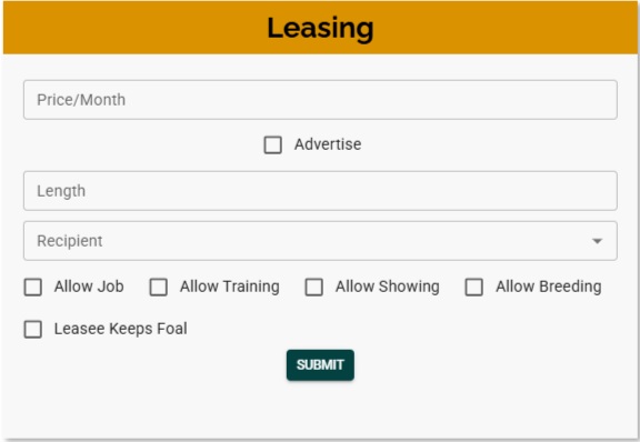 To set up a direct lease, go to your horse's Management section, and scroll down until you see the ‘Leasing’ box. Enter the monthly fee you are requesting (which will be paid each game month while the horse is being leased!), leave the Advertise box unchecked, enter the number of game months they will be leased for in the Length box, then type in the Lessee's Ranch name in the Recipient box, and check any of the boxes for what they are allowed to do with the horse.
