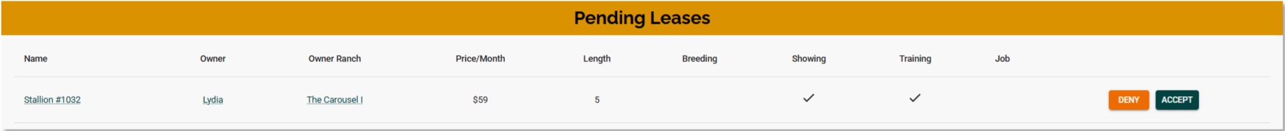If everything looks acceptable to you, click ‘Approve’. Note this will NOT start the lease immediately. The lease will then be bounced back over to the potential lessee to accept or deny. Once they accept, THEN the lease will begin. The reason for this back and forth is to ensure that everyone is happy with the terms, and then the lease only starts when the lessee is active and ready for the horse to come to their ranch.